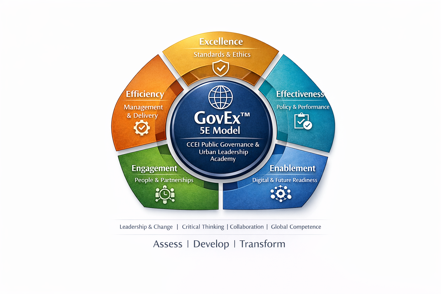 The GovEx™ 5E Model, developed by the CCEI Public Governance & Urban Leadership Academy, defines the core capabilities required for high-performing governments, institutions, and public leaders. It integrates global standards inspired by institutions such as the World Bank and OECD, while establishing a practical, performance-driven governance model.