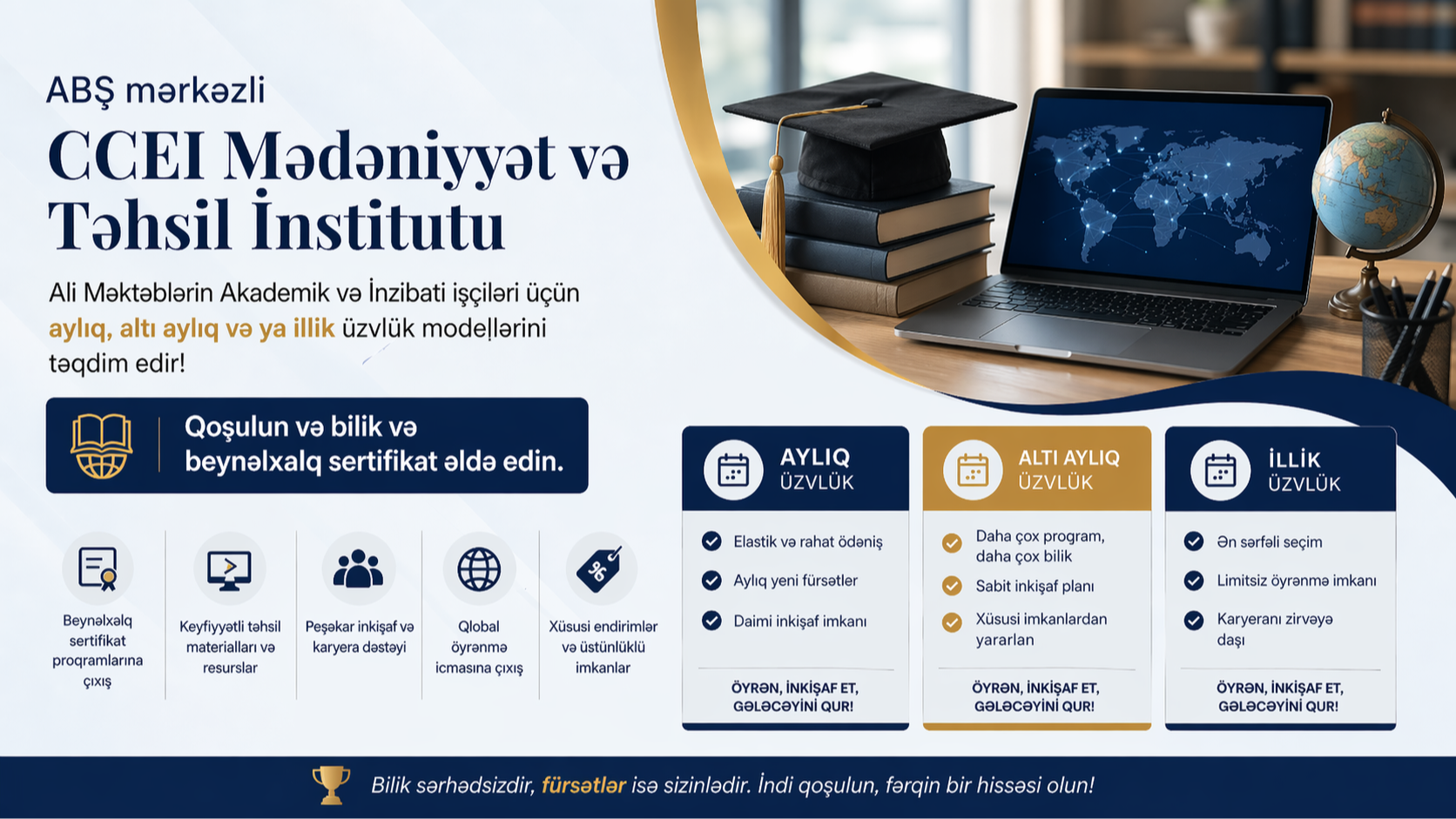 ABŞ mərkəzli CCEI Mədəniyyət və Təhsil İnstitutu ali məktəblərin akademik və inzibati işçiləri üçün aylıq, 6 aylıq və illik üzvlük modellərini təqdim edir. Seçdiyiniz üzvlük modelindən asılı olaraq beynəlxalq sertifikat proqramlarına, self-paced təlim materiallarına, canlı master-klasslara, ekspert məsləhətlərinə və qlobal öyrənmə icmasına çıxış əldə edirsiniz.