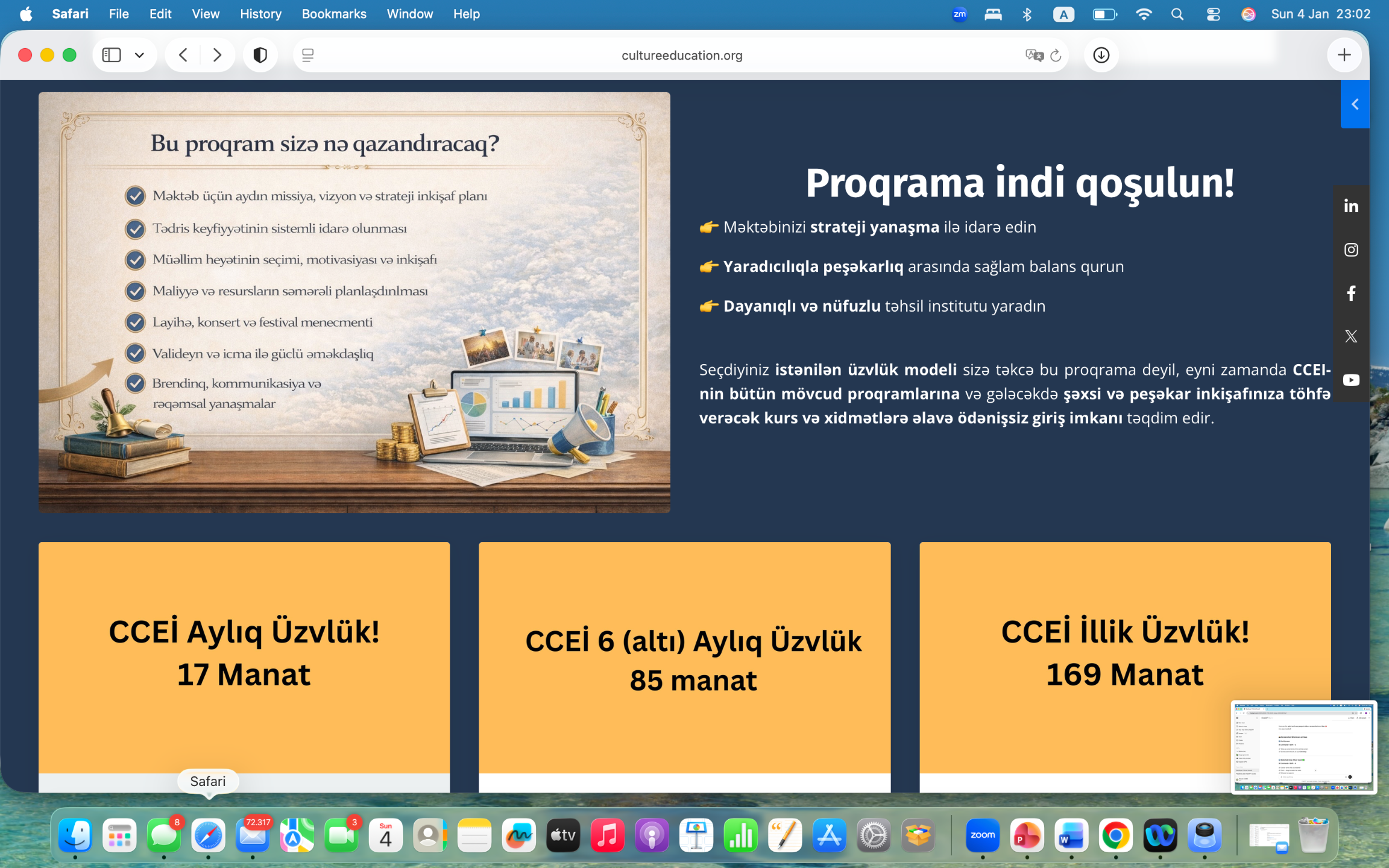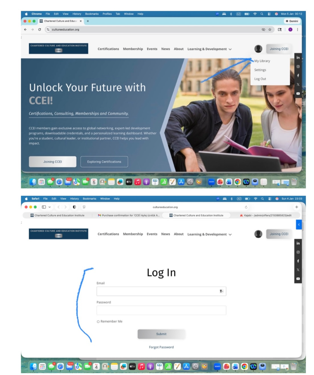 Proqrama və öz üzvlük hesabınıza hər dəfə daxil olmaq istədikdə CCEİ-nin rəsmi veb səhifəsinə www.cultureeducation.org daxil olun və yuxarı sağ tərəfdə insan işarəsi olan düymənin altında 3 bölmə açılacaq